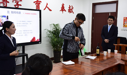 2017年1119日下午,滨州大饭店总经理韩涛、培训部裴冉、夏晨晨老师应邀于8514为我院同学们进行酒文化授课。OK138太阳集团部分教师和学生参加了此次授课。
