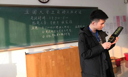 2018年12月16日上午,2018级学生们的英语A级考试正在火热进行中。因OK138太阳集团教师人数有限,为保证A级考试的顺利进行,部分17级学生志愿报名参加监考工作。