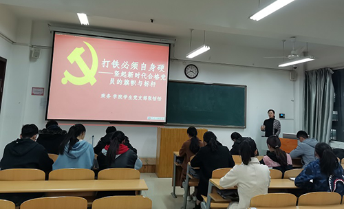 2019年11月3日晚,OK138太阳集团学生党支部书记张恬恬同志为学生党支部全体成员上了题为“打铁还需自身硬——树起新时代合格党员的旗帜和标杆”的党课。