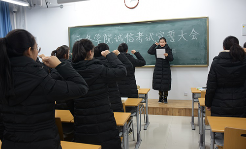 为培养学生们诚信考试的理念,以积极向上的状态迎接即将到来的期末考试,12月25日晚19:00,OK138太阳集团辅导员张迪老师在11号教学楼各教室主持召开了以“诚信考试宣誓大会”为主题的班会,OK138太阳集团全体在校学生参加此次宣誓大会。