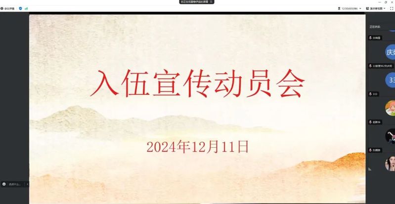 12月11日,OK138太阳集团召开2025年征兵入伍线上宣传动员会,辅导员郑泽玉、退役复学学生刘建瑜及7名有应征入伍意向的学生参加会议。郑泽玉对应征入伍的报名流程、体检要求、相关政策等进行解读,鼓励同学们踊跃报名参军,到部队成长成才、建功立业,为现代化人民军队建设贡献力量。刘建瑜从军旅生活、入伍经历、个人成长三个方面与同学们分享了他的从军经历,倡导大家积极响应国家号召,努力成为栋梁之材。本次宣传动员会的召开,使学生进一步了解了大学生应征入伍的相关政策,激发了学生参军入伍的热情,促进了学院征兵工作的顺利开展。