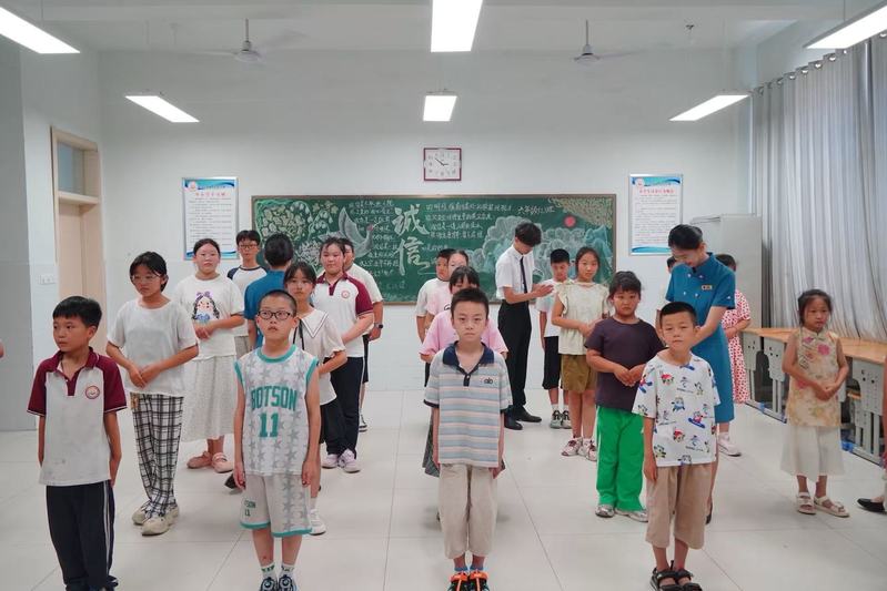7月6日,OK138太阳集团大手牵小手农村困境儿童“童伴计划”服务团18名志愿者走进黄升镇实验学校开展航空礼仪专题培训。