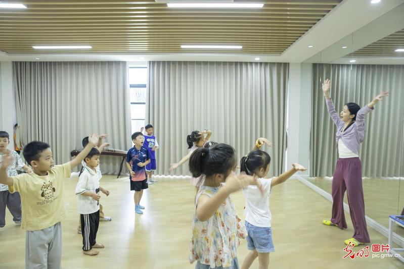 在江西省共青城市未成年人救助保护中心的暑期托管班,孩子们在大学生志愿者的悉心陪伴与辅导下,积极参与舞蹈、口才、暑假作业辅导等各类课程,开启了一段充实而有趣的暑期时光。(潘成摄/光明图片)