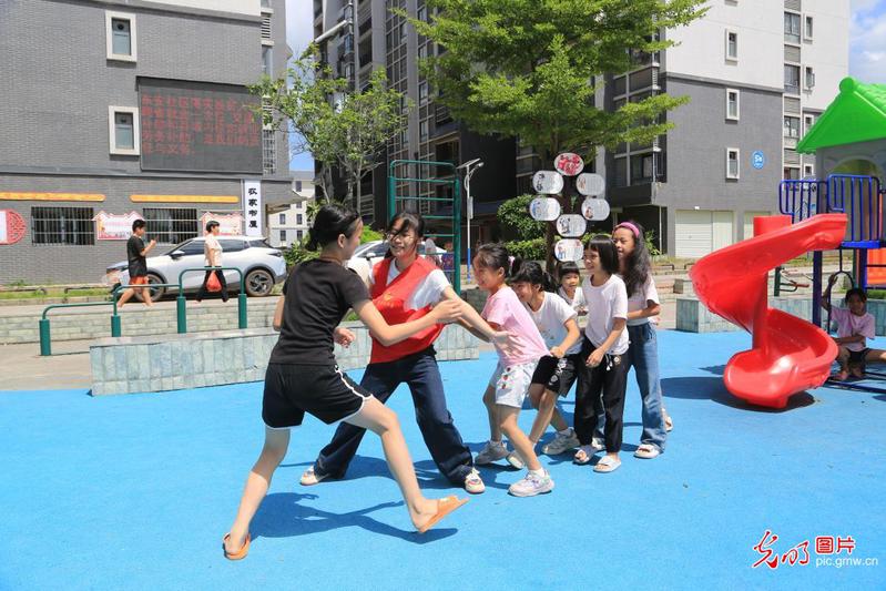 在江西省瑞昌市南义镇中心小学,来自南昌大学的大学生志愿者们与孩子们一起玩跳绳游戏。暑假期间,大学生志愿者与孩子们一起学习、共同娱乐,让孩子们开心、家长们放心。(魏东升摄/光明图片)