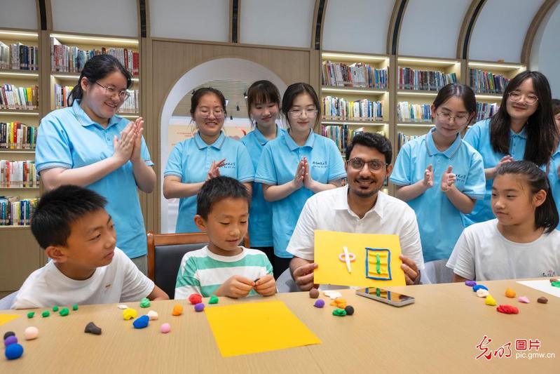 在安徽省芜湖市繁昌区孙村镇中分村,安徽师范大学巴基斯坦籍国际大学生(前左三)在展示和暑托班的孩子一起做的手工作品。通过互动游戏,中外青年以寓教于乐的方式激发儿童创造力。(肖本祥摄/光明图片)