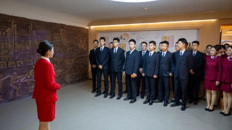 活动现场,讲解员围绕学校办学历程展开系统讲解,重点聚焦航空服务领域的发展历程。从学校紧跟民航业需求、布局相关学科的初心,到逐步完善专业教学体系与实训设施的建设历程,再到历届校友凭借过硬本领在民航岗位上屡获行业荣誉与社会认可,生动展现了学校深耕民航教育、培养行业人才的坚实足迹。